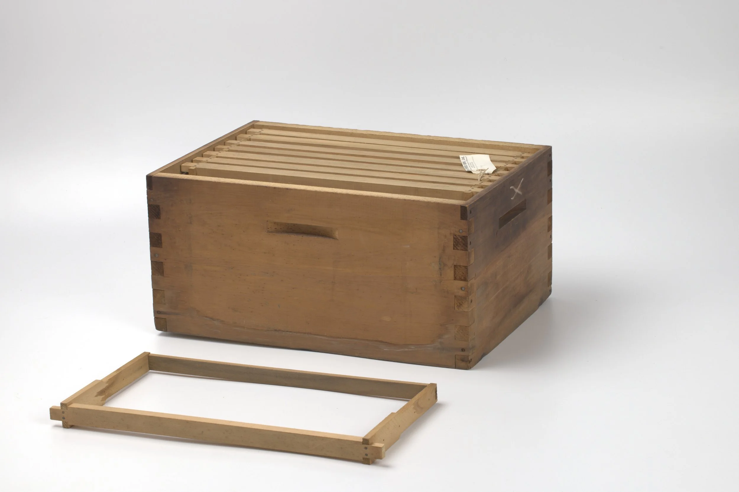 This hive is made in two sizes - 8 frame and 10 frame. The lower portion is for brood, and the upper, called a 'super', is for honey storage. When in operation this hive may have as many supers (top boxes) added to it as the bees may require.